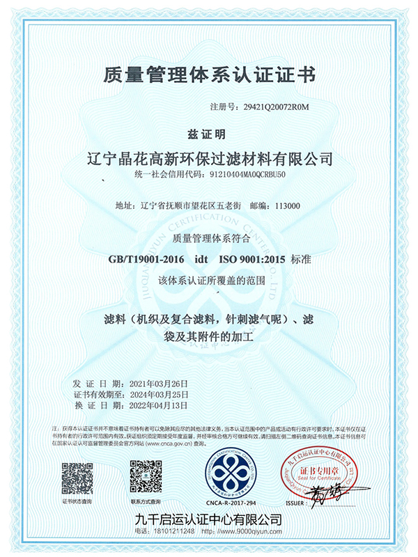遼寧晶花高新環(huán)保過濾材料有限公司主要生產(chǎn)設備來自德國海爾格特、布魯克耐、庫斯特公司,針刺梳理設備來自英國,極大提高產(chǎn)品抱合能力、均勻度.....